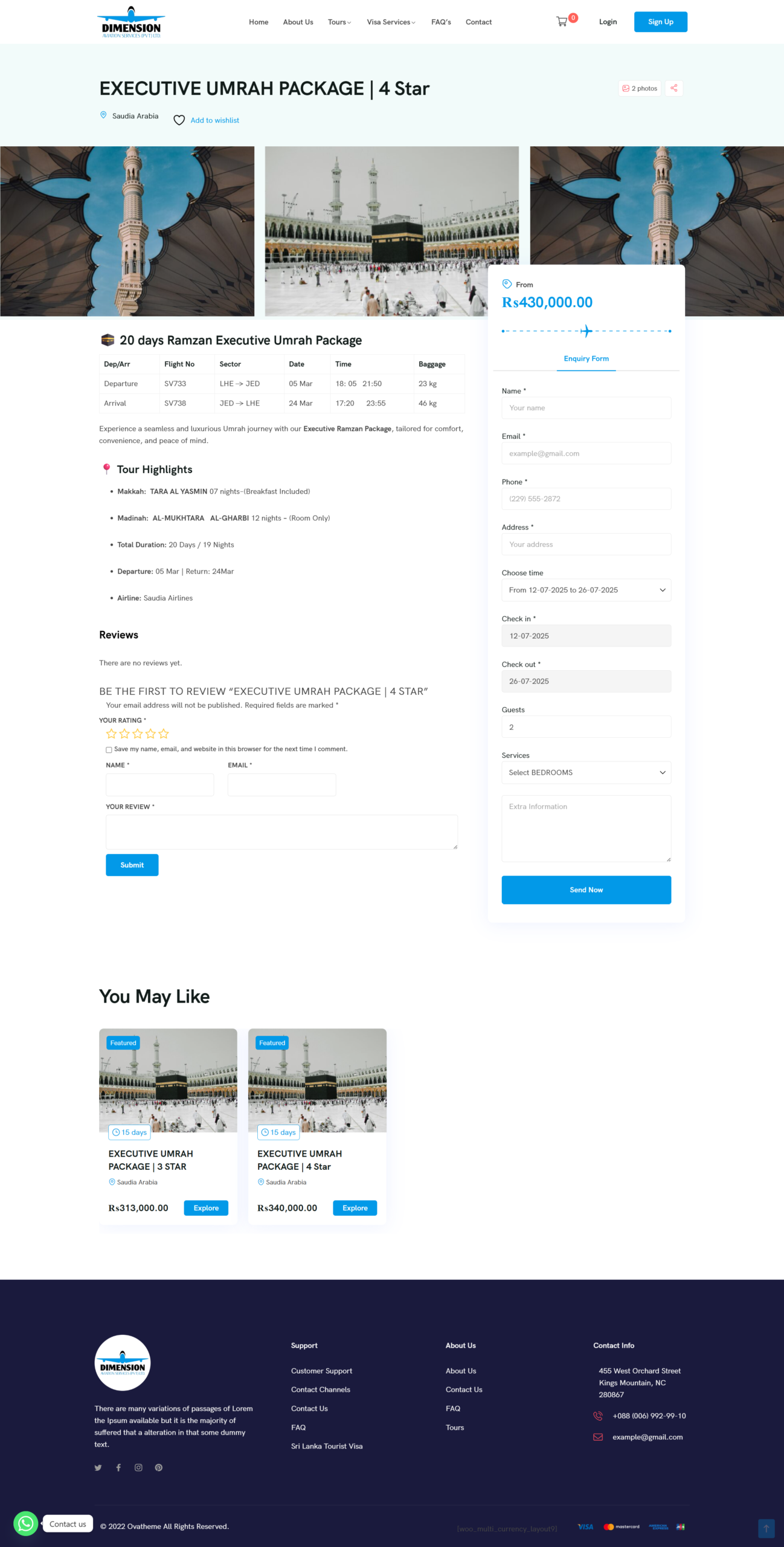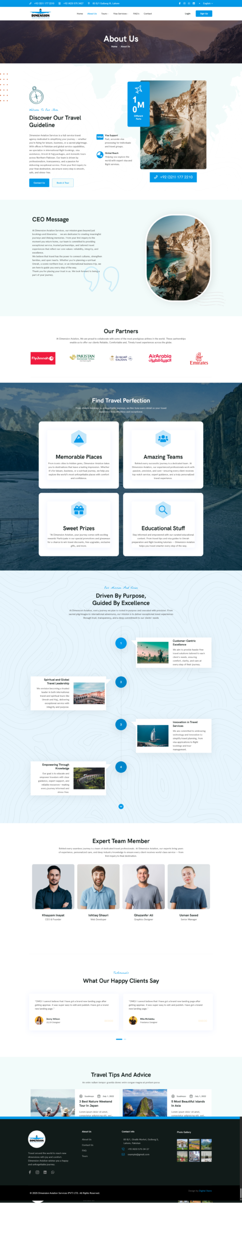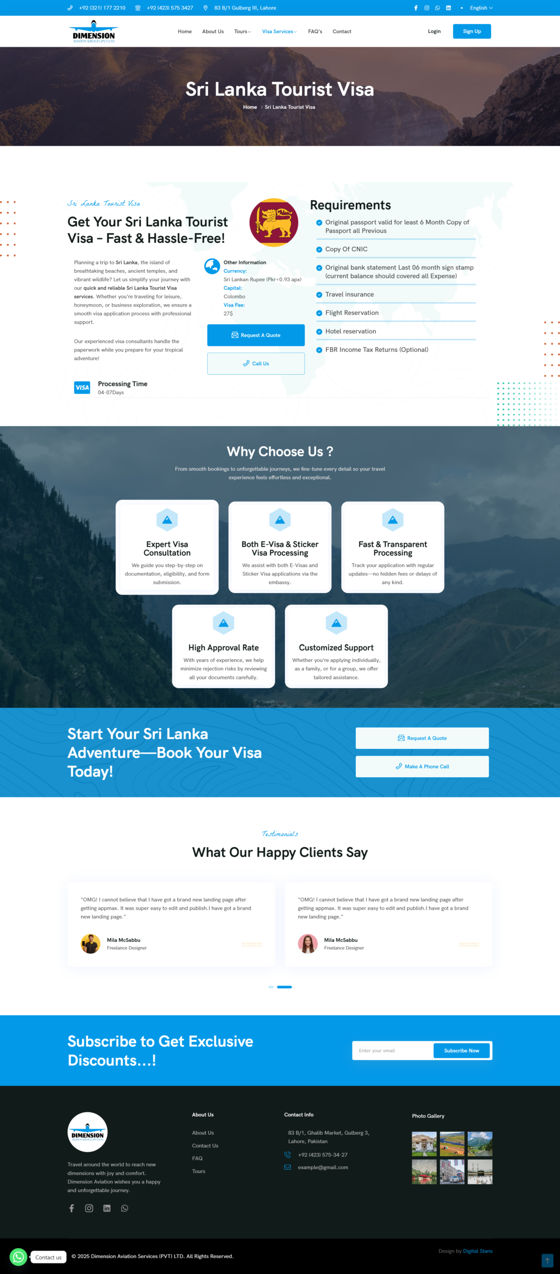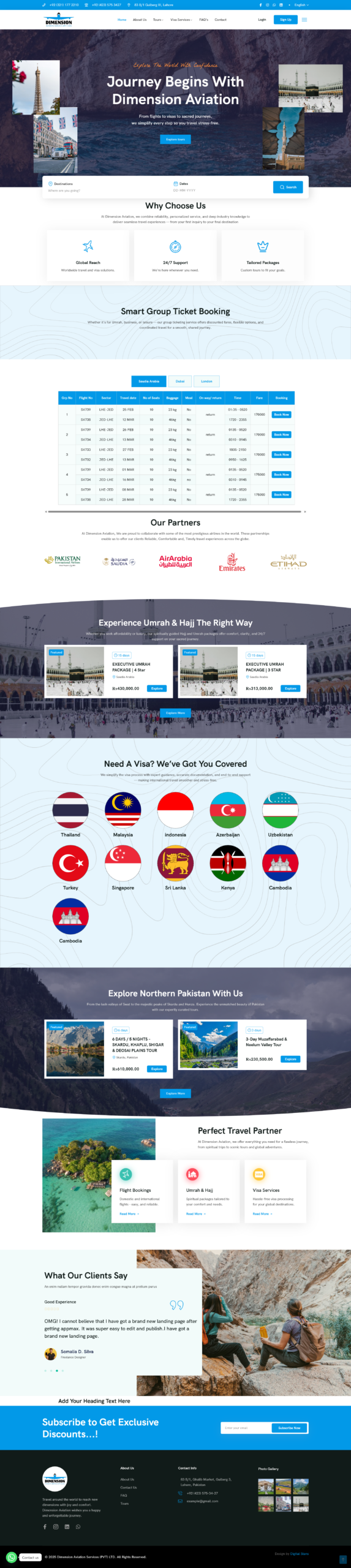 I designed and currently maintain the website for Dimension Aviation, creating a clean, conversion-focused platform that clearly presents their flight bookings, visa services, Hajj & Umrah packages, and tour offerings. Built with WordPress and Elementor, the site was structured to guide visitors from service discovery to direct inquiry through strategically placed CTAs, integrated chat support via Chaty, and optimized contact forms using Contact Form 7. WooCommerce was implemented to support scalable service expansion, while TablePress was used to organize structured travel information. Alongside the initial web design, I provide ongoing maintenance to ensure performance, security, and seamless user experience.